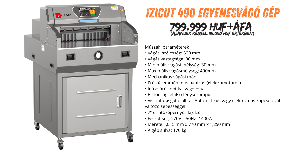 Professzionális elektromos egyenesvágó gép 490 mm-es szélességgel. Akár 8 cm vastag papírköteg vágására is képes. Az érintőképernyő lehetővé teszi a különböző típusú vágások kiválasztását és akár 100 program tárolását. A hátsó ütköző tizedmilliméteres elmozdulását kezelő elülső gomb és a két oldalsó kocsival ellátott mozgásrendszere optimális mérési pontosságot garantál. Kerekekkel felszerelt, amelyek lehetővé teszik a gép könnyű mozgatását.