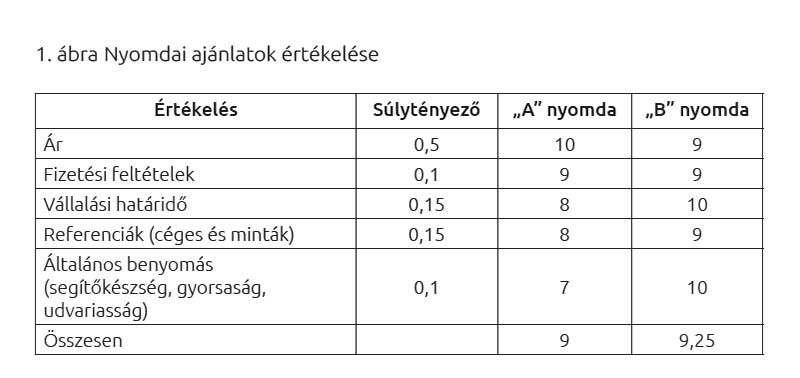 Miután „közös nevezőre” hoztuk az ajánlatokat, a következő legfontosabb tényezők értékelése után hozhatjuk meg döntésünket. A súlytényezőket mindenki saját belső preferenciái alapján alakítsa ki! Az 1. ábra egy példát mutat be az értékelési folyamatra.